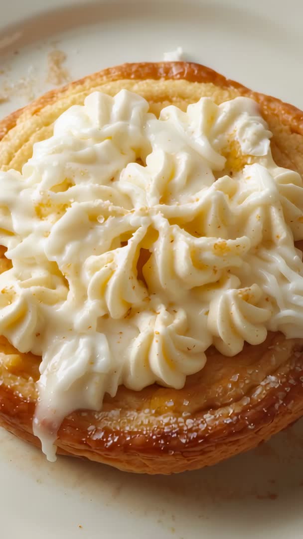 AI Generated Video. Vertical macro video showing glazed round pastry topped with piped cream rosettes and light sugar dusting on white plate. Camera moving slowly across flaky golden crust, glossy glaze and creamy piped swirls, capturing texture and shine. Close-up framing leaving negative space at top and bottom for text, logo or lower-third graphics. Perfect for social media reels, recipe tutorials, bakery marketing, menu video loops and food ads. Suggested postproduction work including warm color grade, subtle vignette and soft music bed, plus cropping to 9:16 vertical for platforms like Instagram Reels and TikTok. Licensing ideas: commercial food branding, cooking channel intros, influencer content, product listings and website hero loops.