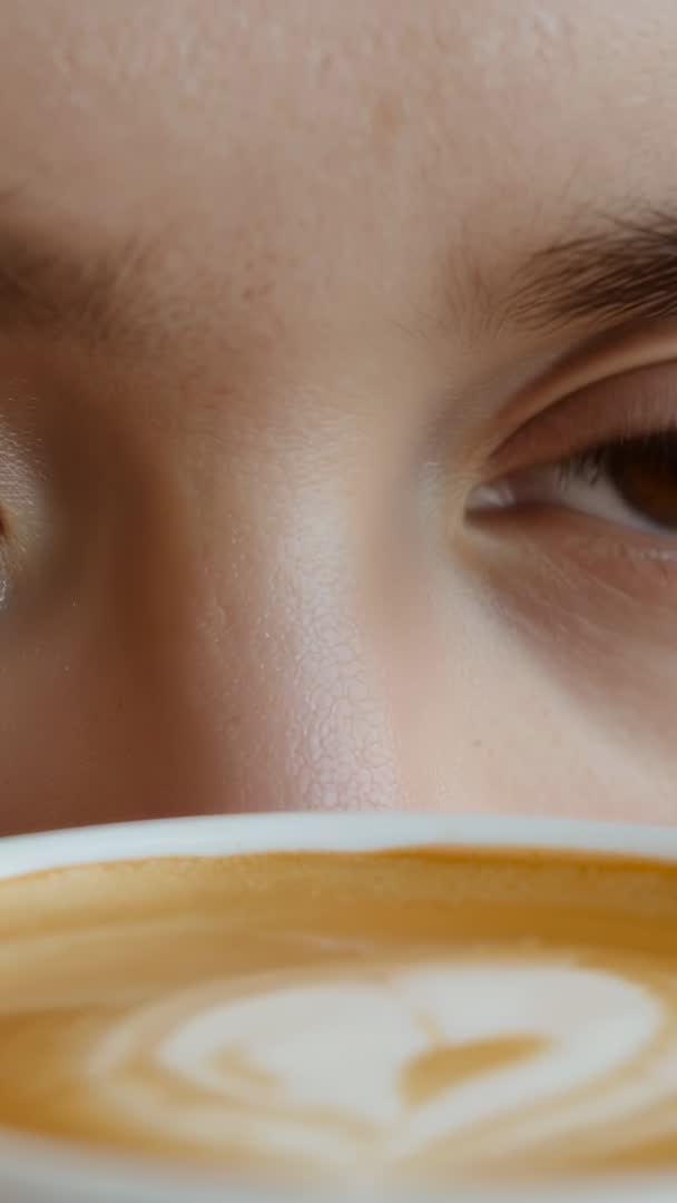 AI Generated Video. Close-up vertical video showing woman holding cup near face, opening eyes slowly and examining latte art heart design. Warm golden tones and shallow depth of field keeping focus on foam texture and subtle facial expression. Ideal for social media reels, cafe promotion, barista tutorial clips, lifestyle content, and brand advertising. Use as intro clip for morning routine videos, menu highlight in mobile ads, background for coffee shop website, or illustrative shot in editorial about coffee culture. Natural, intimate mood conveying calm, curiosity, and sensory experience of tasting specialty coffee.