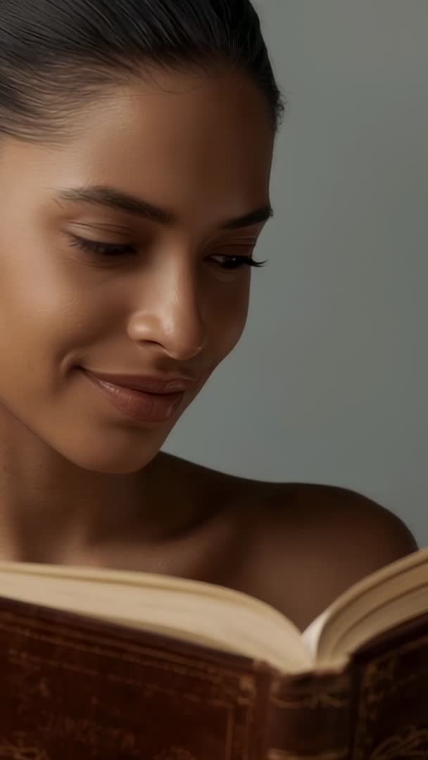 AI Generated Image. Vertical video showing woman reading vintage hardcover book, smiling softly and contemplating passage. Soft studio lighting highlighting smooth skin texture and relaxed facial expression. Composition focusing on face and open book while leaving clean negative space for text overlays or captions. Ideal for social media reels, Instagram and TikTok ads, beauty and skincare campaigns, wellness and mindfulness content, book promotion reels, author interview openers, editorial lifestyle pieces. Useful as intro clip, background B-roll, hero shot for landing page, or vertical ad. Suggested styling: warm neutral grade, subtle vignette, gentle slow zoom or parallax to enhance intimacy. Include space for logo or headline on right side to maximize vertical format.