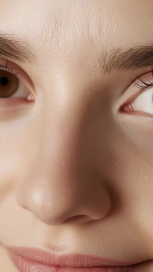 AI Generated Video. Vertical closeup video showing female face opening and revealing eyes while shifting gaze in soft studio light. Camera focusing on nose, lips, skin texture and brow details. Clip starting with eyes slightly closed, then opening and moving side to side, finishing with gentle smile and calm expression. Lighting creating neutral, flattering skin tone and subtle highlights. Useful for beauty and skincare promos, cosmetic tutorials, eyelash and eyebrow product demos, facial expression studies, identity reveal sequences, and vertical ad spots. Ideal for social media reels, app intros, website hero sections, commercial edits, and mood-driven montages. Editors may crop for extreme closeup, apply slow-motion or color grading, add text overlay for captions or product copy, and pair with soft ambient music to enhance emotional tone.