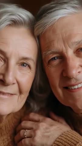 AI Generated Video. Vertical video clip showing closeup of senior couple sharing warm smiles and tender embrace while leaning together. Clip capturing eye contact, gentle hand resting on partner, wedding ring clearly visible, and fine facial details with natural wrinkles and expressions. Soft warm lighting and shallow depth of field creating intimate, comforting mood ideal for emotional storytelling. Footage suiting senior living marketing, retirement planning campaigns, healthcare and caregiving communications, family lifestyle stories, social media reels, and anniversary promotions. Clip working well for website hero banners, video ads, Instagram stories, testimonial segments, brochure covers, greeting cards, and nonprofit outreach materials. Color grading and pacing allowing smooth integration into longer lifestyle sequences or standalone vertical content.