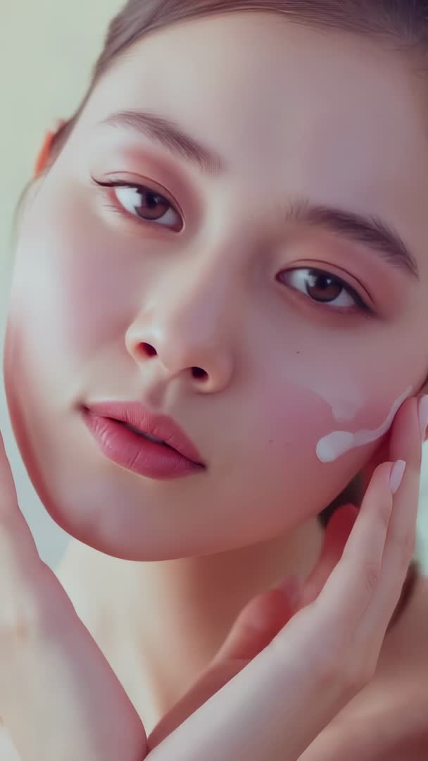 AI Generated Image. Closeup vertical clip presenting model pressing palms to cheeks while gently smoothing moisturizer across right cheek. Soft pastel lighting creating calm, glowing skin mood and highlighting natural skin texture, lips and eyes. Camera focusing on facial movement and hand placement, capturing subtle cream trails and delicate touch for intimate, soothing feel. Useful for skincare and cosmetics brands, product tutorials, social media reels, mobile ads, app hero visuals, e-commerce banners, spa and wellness campaigns. Suggested uses include slow-motion segments, loopable short clips for stories, split-screen before/after comparisons, text overlays for product benefits, voiceover routine guidance, and thumbnail stills for beauty blogs. Shot format 9:16 vertical, recommended duration 6-15 seconds, color grading favoring soft pastels and natural skin tones.