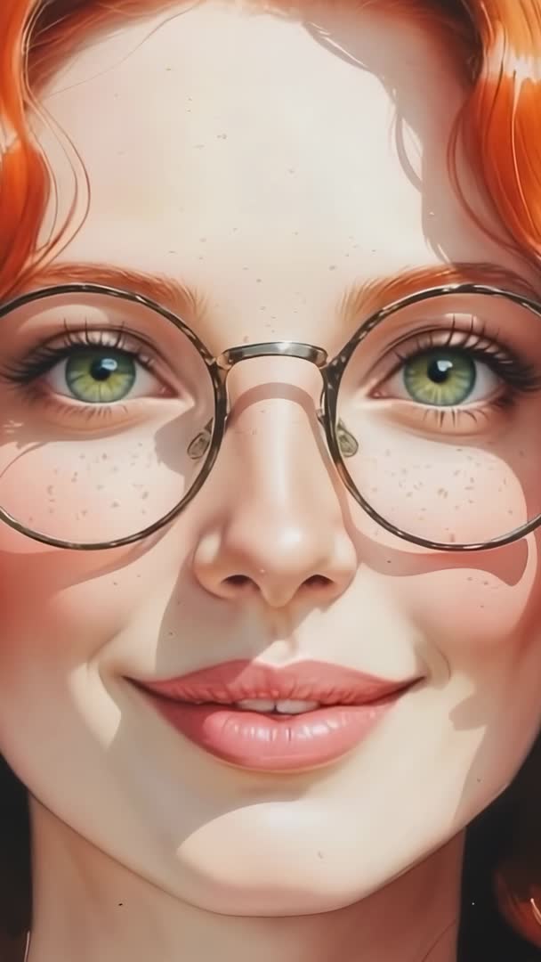 AI Generated Image. Zooming camera capturing close-up of freckled red-haired woman smiling while wearing round metal glasses. Green eyes catching light, long eyelashes fluttering, soft rosy lips parting into gentle smile. Painterly color grading and soft studio lighting enhancing freckles and warm hair tones. Serving well for eyewear advertising, beauty and skincare hero content, social media vertical reels, optometrist websites, lifestyle vlogs, influencer intros, dating app profiles. Offering edit-friendly framing with space for lower-third text and logo overlay. Providing mood of approachable confidence and natural charm for blog headers, product pages, tutorial videos on choosing frames, or promotional reels.