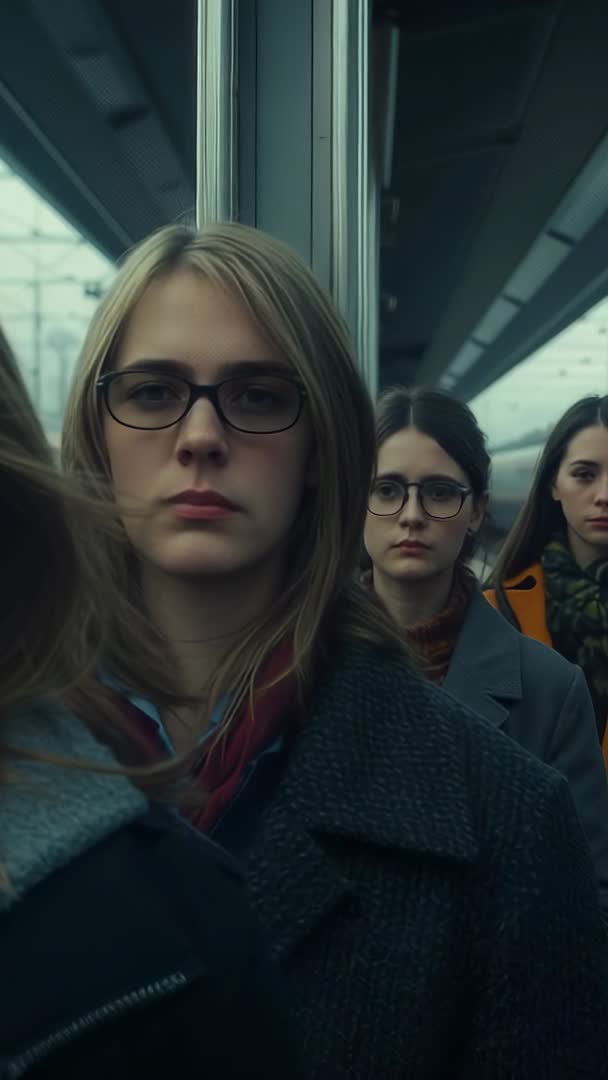 AI Generated Image. Showing vertical 9:16 sequence depicting contemplative woman blinking while standing on train platform beneath canopy. Focusing on subtle facial expression with camera panning and zooming after blink, creating cinematic pause and introspective mood. Featuring commuters in coats and glasses with strong architectural lines and overhead roof adding minimalist urban geometry. Working well for social media vertical ads, streaming intros, editorial pieces about commuting, mental health, urban isolation, or transport campaigns. Suitable for smartphone video backgrounds, Instagram Reels, TikTok, news packages, documentary sequences, web headers and digital banners. Recommending cool teal color grade and muted contrast for moody look. Suggesting slow in/out cuts, adding subtle ambient train sound or soft piano for emotional impact. Noting model release consideration for commercial use when subjects are identifiable.