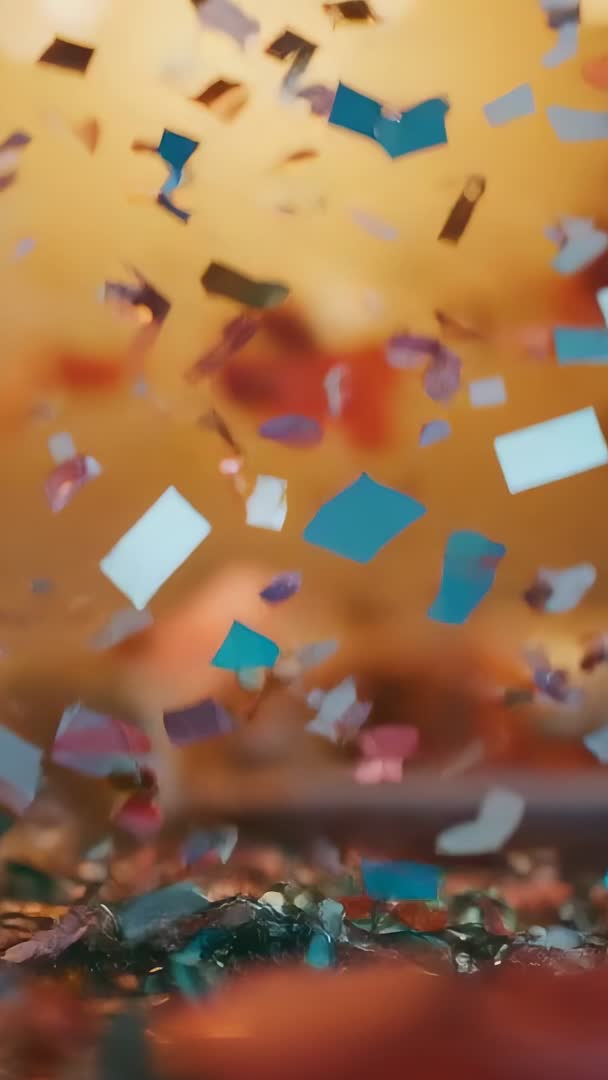 AI Generated Image. Showing confetti fluttering and drifting in slow-motion over tabletop with warm bokeh background, creating glamorous celebratory mood for vertical formats. Creating dynamic hero clip for event promos, party invitations, social media reels, mobile ads, and title intros. Complementing birthday, wedding, New Year, anniversary, product launch, and award ceremony projects. Working well as overlay, background loop, transition element, or intro for Instagram Reels, TikTok, Snapchat, and vertical ad campaigns. Suggesting color grading toward warm gold tones and boosting contrast for richer glamour; suggesting trimming start and end frames for seamless loop and slow-motion emphasis.