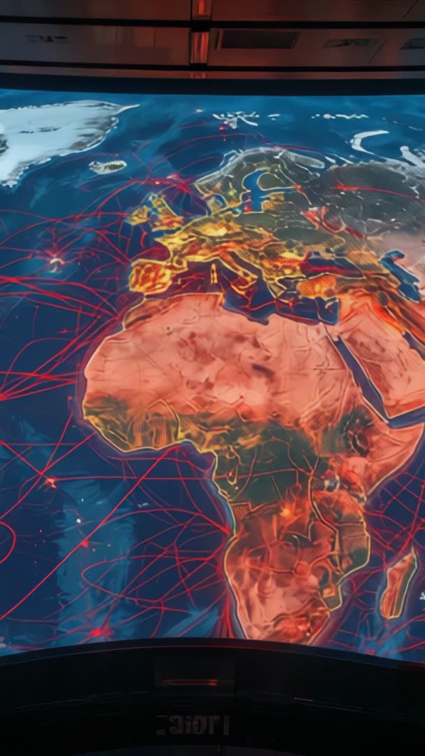 AI Generated Image. Displaying curved vertical control room video showing interactive Earth map overlaid with red network lines and glowing nodes. Visualizing global connectivity and data flows across Europe and Africa with warm land tones and cool ocean contrast. Serving technology presentations, telecom marketing, cybersecurity briefs, infrastructure reports, data visualization demos, museum exhibits, corporate command center promos. Targeting social vertical formats like Instagram Reels, TikTok, mobile ads, digital signage. Recommending looping background, adding branded overlay, animating node pulses, syncing with voiceover or music, applying color correction for higher contrast. Suggesting caption ideas for storytelling: 'Tracking global network traffic', 'Visualizing undersea cable routes', 'Real-time connectivity map'.