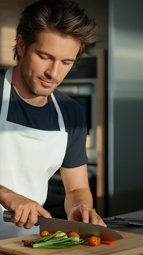 AI Generated Image. Vertical cooking clip showing man wearing white apron chopping cherry tomatoes, spring onions and bell peppers on wooden cutting board. Warm sunlight casting soft glow on face and countertop. Close-up framing focusing on hands, knife technique and vibrant produce, creating calm minimalist lifestyle atmosphere. Useful for cooking tutorial, recipe reel, meal prep content, healthy eating campaign, kitchenware advertising, culinary class demo, blog hero shot or social media promo. Editing tips: crop for vertical mobile formats, add upbeat background music, include step-by-step captions and quick cuts to emphasize technique. Footage length working well for intro sequence, product demo or short form content.