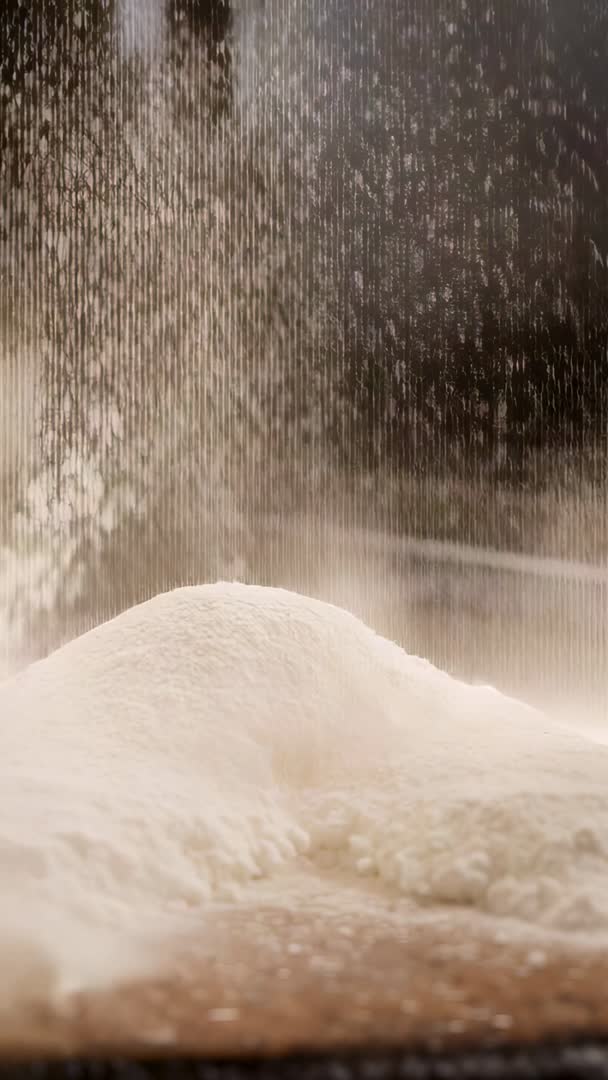 - Vertical cooking video sifting fine white flour cascading onto wooden board forming mound