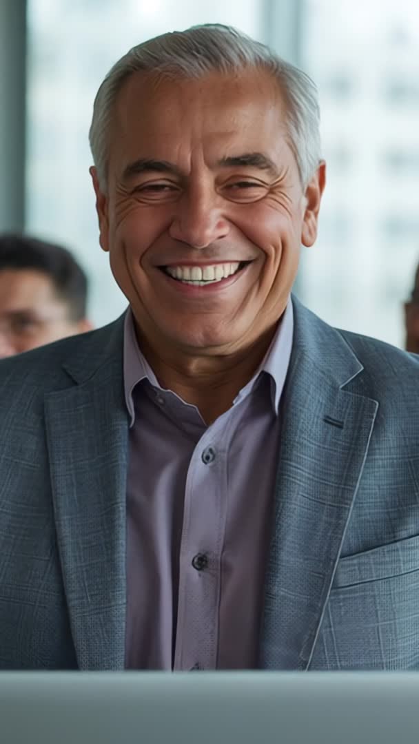 Vertical corporate video showing senior executive smiling and reviewing laptop in meeting Video