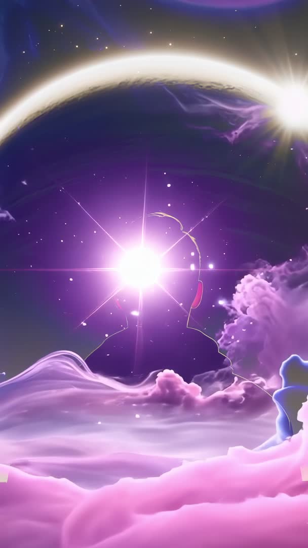 AI Generated Image. Video showing vertical cosmic scene with intense starburst erupting from silhouetted figure, violet nebula clouds swirling below, glowing planetary arc curving across upper frame. Lighting delivering dramatic contrast with central flare projecting sharp rays and subtle lens halos. Color palette focusing on deep purples, magentas, soft pinks, and cool blue highlights for cinematic atmosphere. Footage suiting vertical social media reels, mobile wallpapers, YouTube Shorts, app intros, music visualizers, and sci-fi trailers. Visual offering ambient background for meditation apps, planetarium promos, educational space content, game intros, and album art. Editing ideas including slow zoom, layered parallax, pulse animation for starburst, and gentle cloud drift to enhance depth. Sound design recommendation using ambient synth pads, chime accents, and low-frequency swell to match mood. Delivering high-impact thumbnail potential when pairing with bold headline text and minimal overlays. Render advice recommending 9:16 aspect ratio and high bitrate for preserving flare detail. Licensing suggestion supporting commercial and editorial use where cosmic, mystical, or dreamlike narrative is desired.