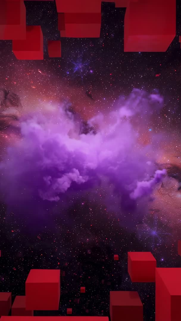 AI Generated Image. Vertical looping video featuring red cubes moving inward to form corridor around glowing purple nebula. Vibrant violet and red palette creating dramatic cosmic mood and deep spatial depth. Perfect for vertical social ads, mobile wallpapers, TikTok and Instagram Reels, music visualizers, title sequences, event openers. Providing clean central space for overlay text and logos while maintaining dynamic animated background. Working well for sci-fi promos, technology brands, electronic music events, streaming thumbnails. Allowing easy color grading to match brand palette and looping seamlessly for continuous playback.