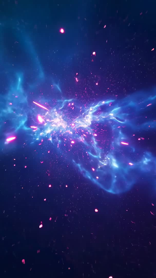 AI Generated Image. Vertical 9:16 video showing nebula eruption at center, emitting magenta streaks and swirling blue energy filaments across deep space. High-contrast neon palette and dynamic particle burst creating cinematic sci-fi mood for trailers, title sequences, app intros, social media reels, and mobile wallpapers. Loop-friendly motion and abstract forms working well for VJ loops, music visualizers, digital signage, streaming intros, and educational animations about astrophysics and universe phenomena. Suggest adding deep bass sound design, subtle camera zoom, color grading to match brand palette, and overlaying text or logo in upper area for title treatments.