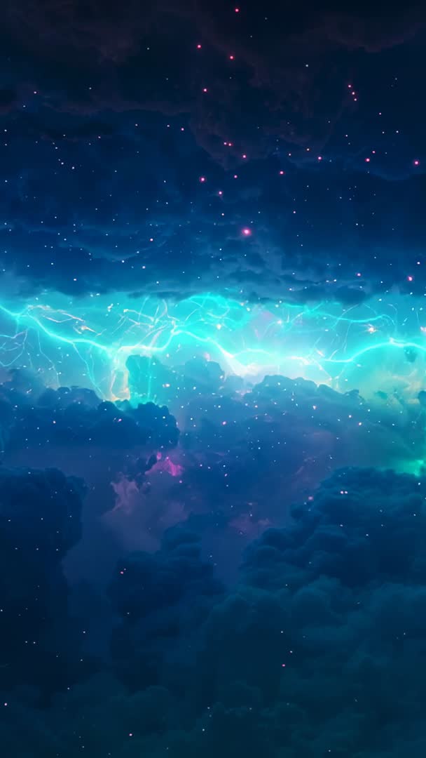 AI Generated Image. Showing pulsing cyan-green nebula band sending electric filaments across dark cloudscape and starfield. Blending teal and magenta highlights with deep indigo shadows for dramatic contrast and cinematic mood. Working as vertical loopable backdrop for mobile wallpapers, Instagram Reels, TikTok, YouTube Shorts, and vertical ad campaigns. Supporting sci-fi trailers, game intros, title reveals, VJ loops, music visualizers, planetarium projections, and ambient meditation displays. Providing high-contrast color palette for color grading tests and VFX compositing. Scaling to vertical resolutions and looping seamlessly for continuous playback.