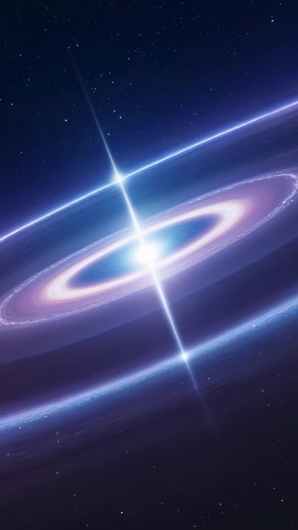 AI Generated Image. Featuring luminous central star emitting perpendicular light jets through glowing concentric rings while distant starfield scatters across background. Color palette blending deep indigo, electric blue, and soft magenta for cinematic, otherworldly mood. Motion showing gentle camera pullback and slow rotation around disk for immersive effect. Optimized for 9:16 vertical format and social story platforms. Ideal for sci-fi trailer backgrounds, title sequences, app intros, vertical social ads, mobile wallpapers, VJ loops, planetarium visuals, and educational astronomy promos. Useful for articles and presentations about pulsars, black holes, accretion disks, cosmic jets, and deep space phenomena. Delivering instant sense of scale and energy for futuristic, tech, and space-themed projects. Provide loopable short clip versions and color-graded variants for different platforms.