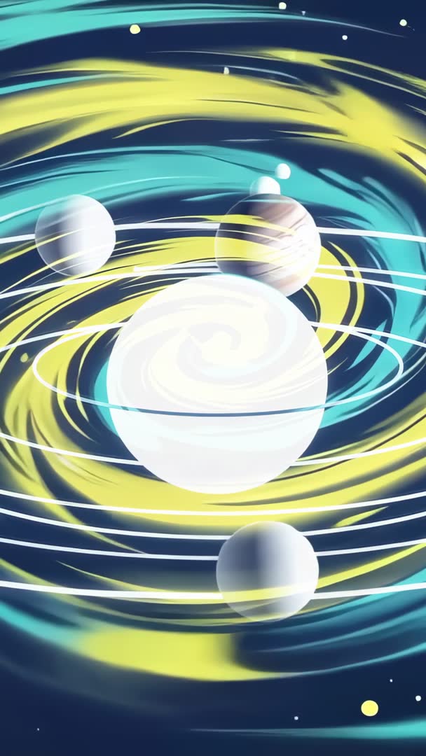 AI Generated Image. Showing glowing central sphere surrounded by orbiting satellites and dynamic teal and yellow energy trails, creating immersive vertical motion. Featuring smooth circular movement and distinct focal core, making it ideal for looped backgrounds, mobile wallpapers, app intros, and social media stories. Allowing overlaying of headlines, logos, and lower-thirds without visual clutter thanks to dark outer edges and clear center. Delivering strong sci-fi and futuristic vibe for space exploration promos, game trailers, educational astronomy clips, and VJ visuals. Providing loop-friendly composition and high-contrast color palette for easy color grading and audio sync.