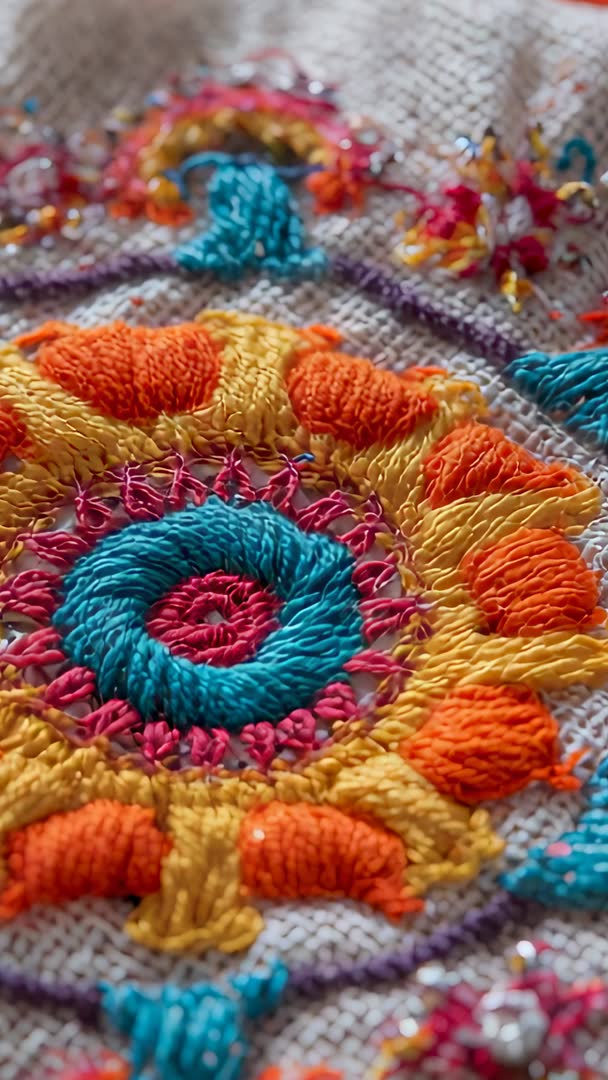 AI Generated Video. Vertical macro video panning downward, revealing hand-stitched circular motif in bright teal, orange, yellow and magenta threads with scattered seed beads. Camera moving smoothly across textured linen, highlighting raised satin stitches, French knots and dense threadwork. Close-up footage showing stitch detail, thread texture, color contrast and artisan handwork. Warm natural light adding soft highlights and subtle shadows. Ideal for craft tutorials, DIY social clips, handmade product listings, textile design portfolios, online workshops, artisan brand advertising and blog hero clips. Editing suggestions: cutting into short vertical reels, looping subtle pan for background motion, overlaying text for step-by-step captions, pairing with soft acoustic music. Licensing suggestions: using for commercial and editorial projects needing colorful craft close-ups and detailed technique demonstrations.