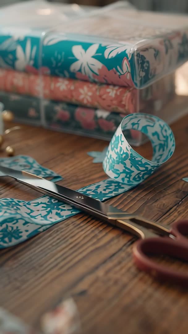 AI Generated Image. Vertical clip showing close-up of hands trimming patterned paper strip with scissors on wooden desk, forming decorative bow for gift wrapping. Visuals featuring warm natural light, shallow depth of field, tactile details, soft bokeh and satisfying cut motion. Use for DIY tutorial, social media reels, craft blog posts, ecommerce product listings, seasonal campaign ads, gift wrap kit promotion and workshop promo. Editing ideas: add step-by-step text captions, overlay upbeat or calming soundtrack, pair with voiceover instructions, loop for short form content, crop for story or portrait aspect ratios. Suitable for background clip in craft classes, handmade product showcase, holiday marketing, relaxing ASMR-style sequences, and hero banner or thumbnail for tutorial series.