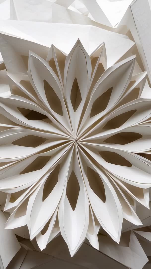 AI Generated Video. Showing tight vertical footage revealing white folded paper rosette with radiating petal layers and precise geometric symmetry. Camera zooming and panning across paper folds, emphasizing crisp edges, soft shadows, and hollow petal cutouts. Offering calm, monochrome visual ideal for craft tutorial intros, vertical social reels, and DIY channel segments. Working well as looping background for branding, product showcase, website hero blocks, or blog headers for wedding, holiday, and interior design topics. Allowing editors to crop, speed-ramp, and color-grade for cohesive campaign assets. Supplying high-detail texture for print mockups, magazine layouts, and packaging concepts related to handmade stationery and decor.