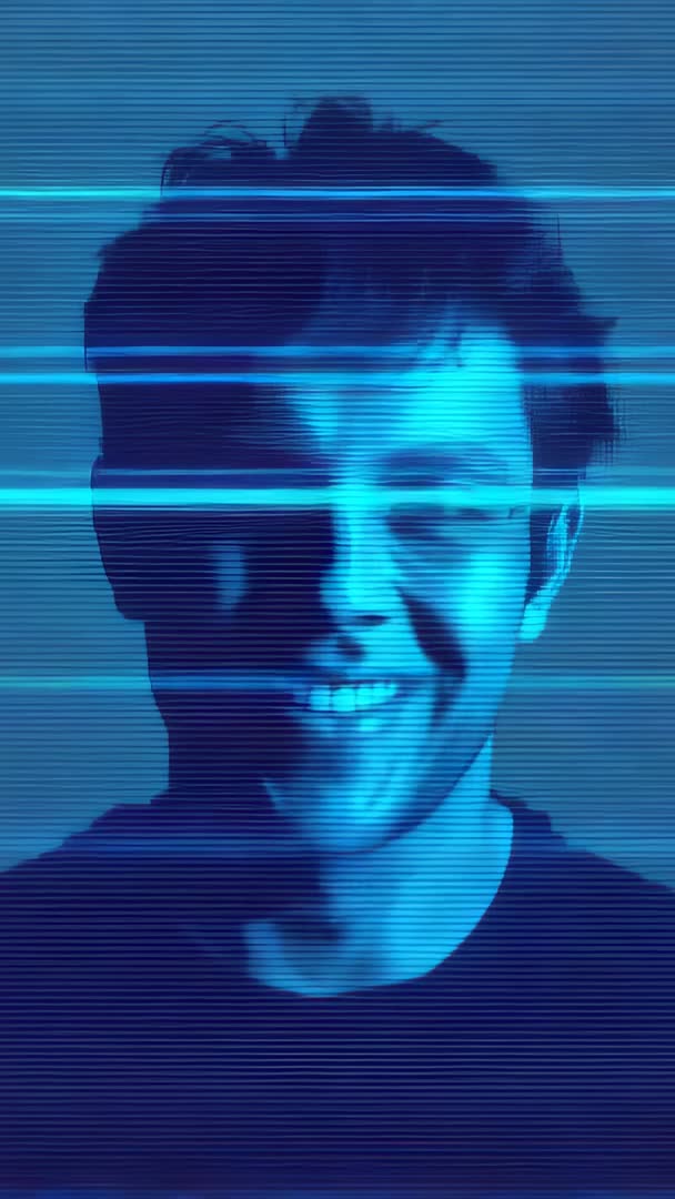 AI Generated Video. Capturing man softening into smile while scanlines shifting across face under cool cyan tint. Creating moody futuristic vibe with half-shadowed profile and streaking digital artifacts. Designed for vertical use, clip working well for social media stories, app intros, tech product promos, cyberpunk trailers, music video overlays. Color grading and overlay text pairing easily; loopable section suitable for background motion, lower-thirds, title sequences. Editing tips: enhance contrast, add glitch sound effects, sync scanline motion to beat for rhythmic feel. Ideal for marketing campaigns exploring identity, digital transformation, emotional transition, youth culture, futuristic aesthetics. Delivering cinematic vertical mood with neutral backdrop and strong visual rhythm.