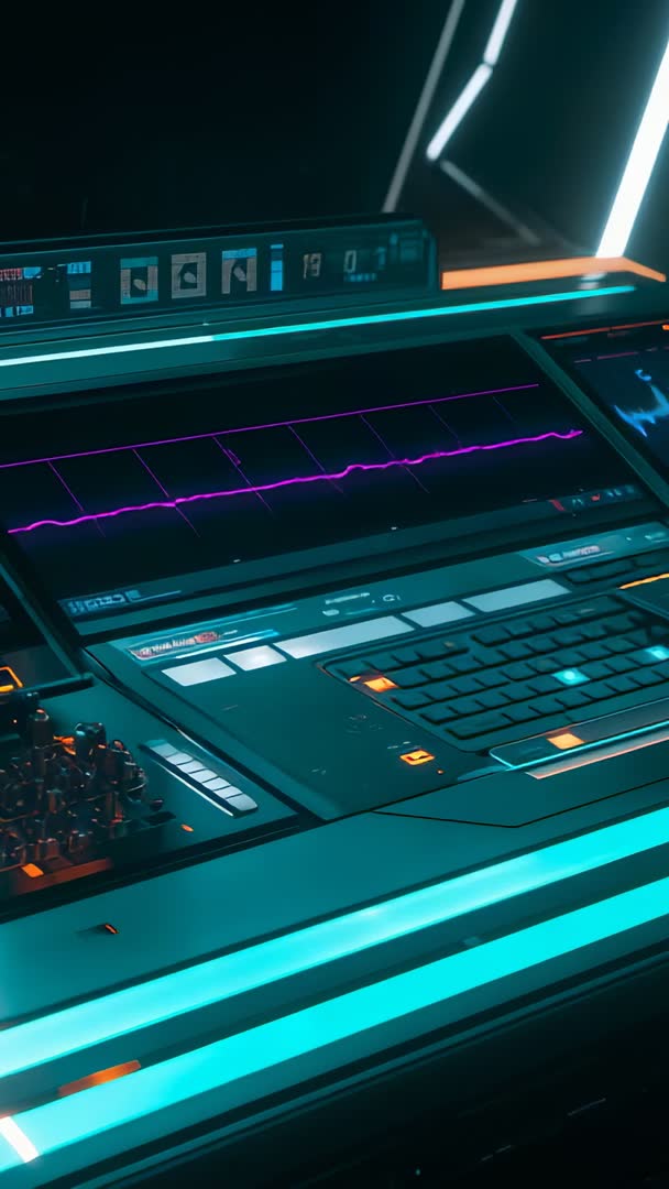 AI Generated Video. Vertical video featuring cyber control console displaying cycling numeric values across touchscreen arrays and pulsing purple waveform on main monitor. Neon cyan and magenta lighting creating high-contrast, low-key atmosphere and conveying futuristic cyberpunk vibe. Close-up framing emphasizing keyboard, toggle switches, status indicators while graphic equalizer and telemetry readouts animating. Footage working well for tech promo, UI demo, startup pitch, product launch, broadcast graphics. Serving as looping background for social media vertical ads, event intros, presentation slides, motion design templates. Suggested color grading including teal/cyan boost, contrast increase, glow to enhance neon accents. Suitable for 1080x1920 vertical format, loop-friendly segments, HDR color workflows. Consider adding subtle electronic sound design to enhance immersive atmosphere and support branding.