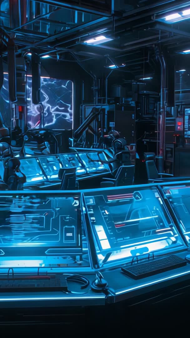 - Vertical Cyber Control Room Video with Holographic Console Pulsing Electric Arcs