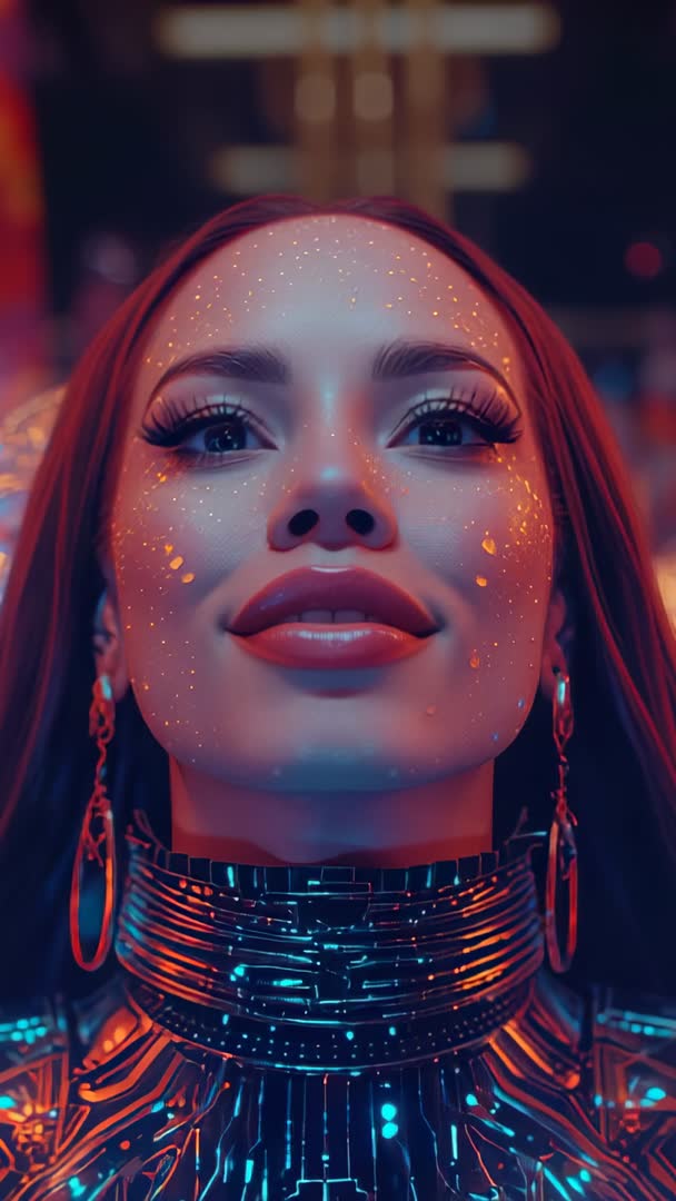 AI Generated Image. Opening vertical video shot showing model shifting into smile under neon lounge lights, face sprinkled with glowing freckles and iridescent makeup. Close-up framing emphasizing long lashes, glossy lips, metallic choker and dangling hoop earrings, blending cyberpunk neon tones with reflective chrome textures. Composition balancing warm orange highlights and cool blue LEDs to create cinematic futuristic mood and confident on-camera presence. Suitable for music video openers, fashion promo reels, beauty and makeup tutorials, nightclub and nightlife advertising, tech and sci-fi brand campaigns, influencer content and social media vertical ads. Use as hero clip for app intros, event promos, product launches, or editorial sequences requiring striking futuristic portrait. Technical notes: vertical 9:16 format, ideal for stories and reels, recommended slow push-in or subtle tilt camera moves, color grading enhancing neon contrast and skin highlights, loopable short segment for continuous playback.