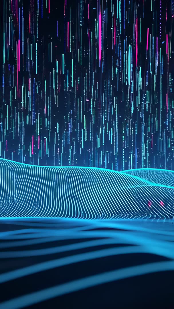 AI Generated Image. Vertical cyberpunk sequence presenting neon data streams falling over undulating cyan wireframe waves, creating immersive futuristic atmosphere. Foreground showing rhythmic glowing lines forming dynamic digital landscape while background displaying vertical falling code and colorful light streaks. Working well for tech presentations, startup promos, app intros, music visualizers, social media vertical reels, smartphone wallpapers, stage backdrops and conference openers. Suiting seamless loops and motion graphics projects, pairing with synthwave music, glitch transitions and bold typography overlays. Providing vivid color contrast and strong vertical motion for storytelling about data flow, AI, connectivity, cyber security and virtual environments. Delivering ready-to-edit footage for branding, UX demos, promotional shorts and futuristic concept visuals.