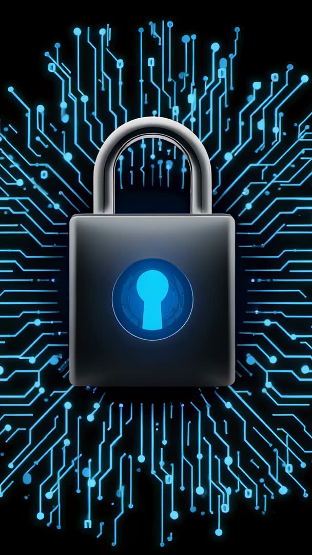 AI Generated Image. Video showing metallic padlock centered over glowing blue circuit traces, evoking network protection and data encryption. High-contrast neon blue circuitry radiating from padlock, suggesting secure infrastructure, firewall, and access control. Suitable for use in tech presentations, cybersecurity tutorials, website hero sections, corporate training, and product demos. Perfect for social media vertical video ads, app intros, explainer videos, webinars, and conference backdrops. Editable for adding headline text, logo overlay, animated transitions, and call-to-action graphics. Color palette featuring dark background with electric blue highlights, matching modern IT branding. Providing strong visual metaphor for data privacy, access management, threat detection, and encryption services. Delivering clean central composition suitable for cropping to vertical formats and mobile screens. Recommended keywords for SEO and metadata tagging.