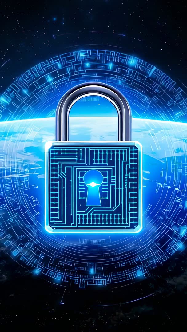 AI Generated Image. Showing glowing neon padlock with circuit pattern and keyhole pulsing in low Earth orbit over planet surface. Surrounding holographic rings and digital circuitry rotating and emitting blue light, suggesting secure encrypted network surrounding global infrastructure. Perfect for cybersecurity brand videos, app intros, vertical social ads, tech conference openers, news segments on data breaches, online course intros, corporate training modules, and promotional clips for VPNs or cloud security services. Providing high-contrast blue color palette and clear central area for logo or text overlay, with safe margins for title and captions. Easily looping visual with steady motion, suitable for Instagram Reels, TikTok, vertical YouTube Shorts, mobile app backgrounds, and website hero sections adapted to vertical format. Including suggestions for use: add subtle glitch transition for emphasis, overlay bold sans-serif headline, synchronize pulsing with audio beat for impact, or animate keyhole reveal for call-to-action. Delivering modern, futuristic mood conveying trust, protection, and technological sophistication.