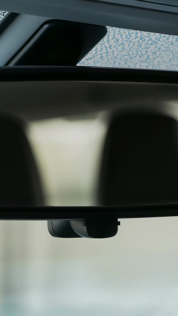 - Vertical dashcam footage focusing on rearview mirror and headrests in modern car cabin