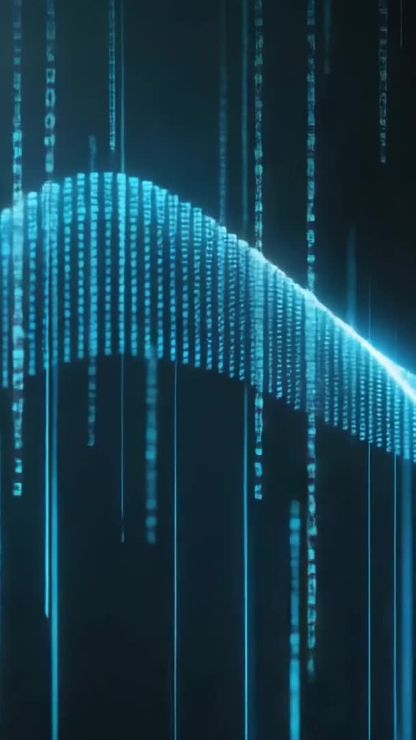 AI Generated Image. Looping vertical video presenting animated blue data ribbon forming smooth sine wave with vertical streams of code falling. Creating futuristic, high-tech mood for cybersecurity, data analytics, fintech, AI, and network visualizations. Fitting into vertical social content, mobile app intros, website hero sections, corporate presentations, and trade show displays. Allowing easy customization by adding logo overlay, inserting text or lower third, adjusting color tones, and syncing motion with audio beat. Mood leaning toward sleek, minimal, cold-blue palette with subtle glow and depth, suitable for looping backgrounds and motion graphics.
