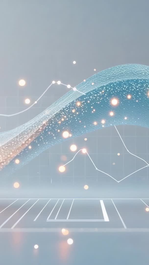 Vertical data ribbon visualizing rising analytics wave with glowing particles, line graphs Video