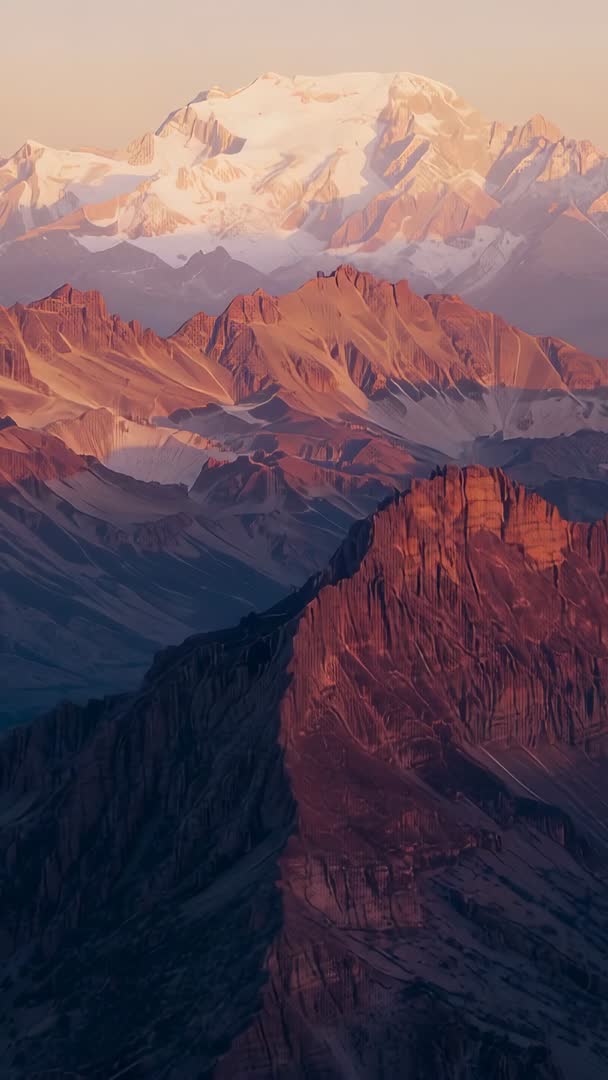 Vertical Dawn Alpenglow Revealing Layered Alpine Peaks Ascending Past Snow-Capped Summit Video