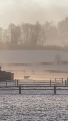 - Vertical dawn video of adult horse walking across snowy paddock through golden mist