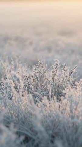 - Vertical dawn video showing hoarfrost-glazed meadow grasses glowing in soft sunrise light