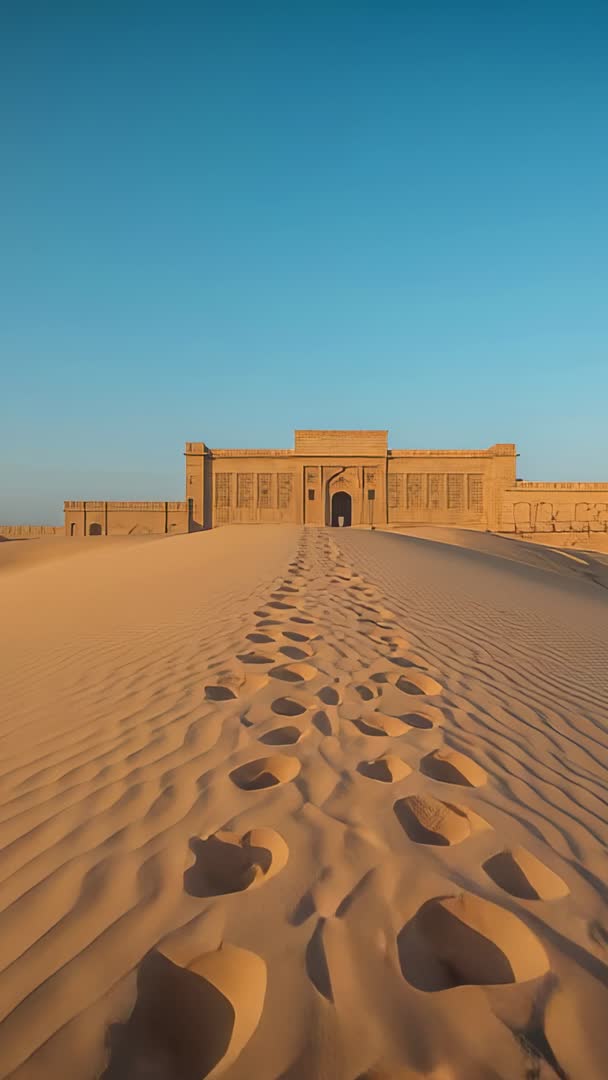 AI Generated Video. Opening on close-up of footprints in soft sand, panning up along rippled dunes toward monumental sandstone facade with arched entrance. Golden hour light casting long shadows and warm amber tones across sand, creating strong contrast with clear blue sky. Symmetrical composition and leading-line footprints producing cinematic sense of journey, discovery, and solitude. Well suited for travel and tourism promos, cultural heritage features, architecture documentaries, vertical social ads, and website hero reels. Useful as establishing shot, background loop, or title card for desert adventure films, history segments, or lifestyle content targeting mobile-first audiences.