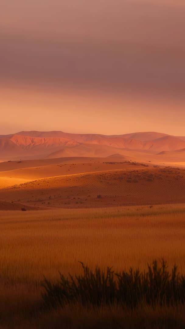 AI Generated Video. Vertical cinematic clip showing shifting golden light sweeping across sand dunes, tall grasses, and distant ridges beneath moody cloud band. Warm amber palette and long shadows creating sense of vastness and solitude in arid terrain. Serving travel promos, tourism commercials, nature documentaries, meditation apps, mobile wallpapers, social media reels, and website hero sections. Working well as atmospheric transition, background loop, title sequence, or brand storytelling asset for calm, expansive moods. Pairing with ambient soundscape and slow instrumental music enhancing cinematic atmosphere. High vertical aspect making it optimal for mobile-first campaigns, portrait video ads, and short-form platforms.