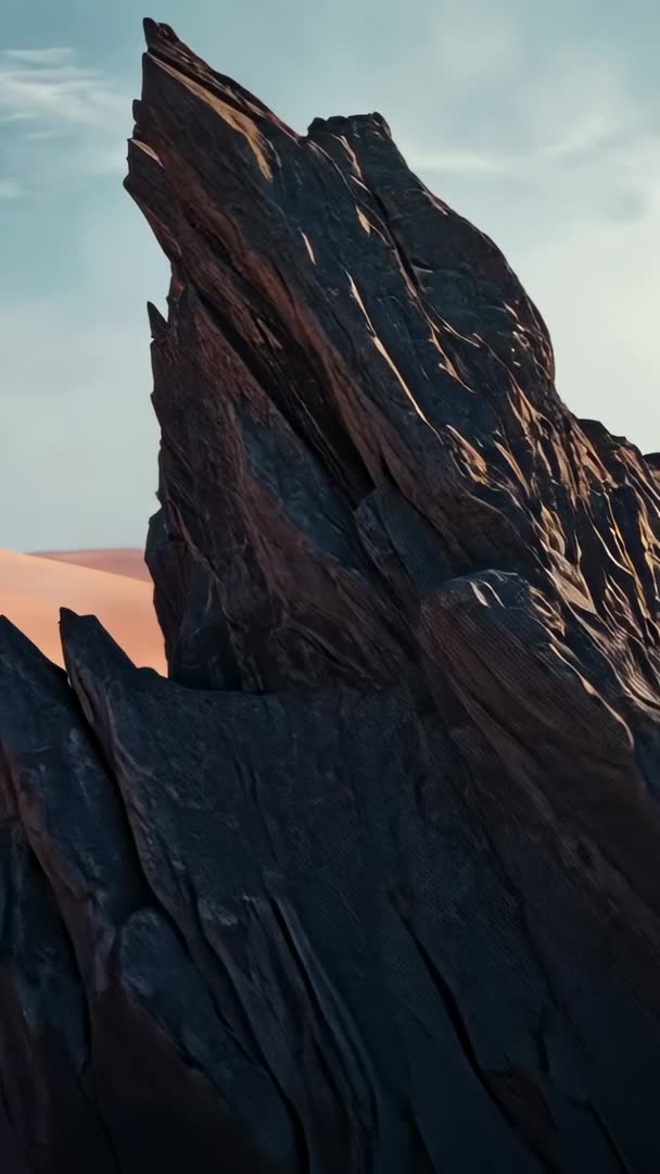 AI Generated Image. Vertical video clip starting camera revealing dramatic jagged rock outcrop rising from sand dune, showing layered strata and textured stone under warm sun. Slow reveal movement emphasizing scale, rugged texture, and contrast between dark rock and pale dune. Suggested uses including nature documentary, geological study, travel promo, outdoor adventure commercial, background for inspirational or meditative sequences. Ideal for vertical social media ads, mobile hero banners, environmental storytelling, museum or education content focusing on erosion and sedimentary layers. Color grading suggestions including warming highlights on sand and cooling shadows on rock to enhance texture. Composing tip including placing captions or titles in upper or lower frame to avoid covering rock silhouette.