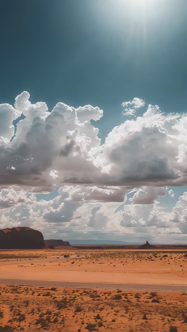 AI Generated Video. Showing vertical cinematic clip, moving camera sweeping across red sand plain, revealing towering cumulus cloud bank and distant sandstone mesas under sunlit sky. Emphasizing contrast between warm ochre foreground and cool teal sky, creating dramatic scale and sense of vastness. Including visible road and scattered shrubs, providing travel narrative and directional flow. Serving travel content, outdoor adventure promos, tourism advertising, environmental storylines, weather segments, mobile backgrounds, social media reels and vertical video campaigns. Leaving ample negative space in upper frame for headline or branding, offering cinematic color grade potential for dramatic LUTs. Delivering calm yet epic mood, suiting opener for road trip films, drone B-roll sequences, landscape montages or background for inspirational quotes.