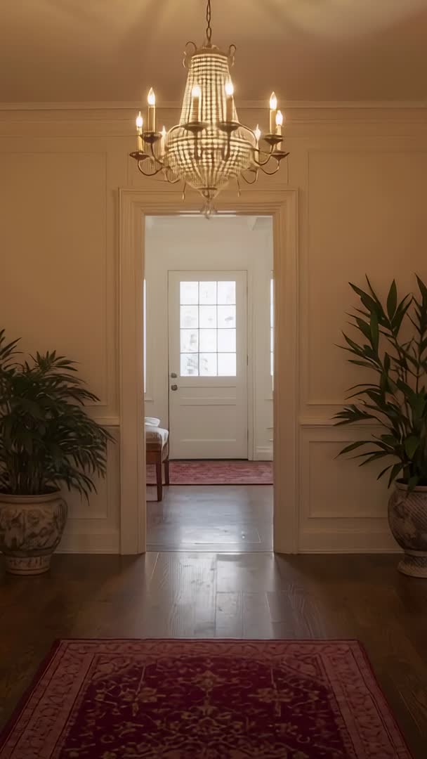 AI Generated Image. Vertical clip showing slow push through foyer doorway, centering on crystal chandelier and patterned runner. Warm ambient light casting reflections on chandelier and hardwood floor, creating elegant, inviting mood. Symmetrical framing with potted plants flanking doorway, crown molding details, glass-paned front door delivering soft backlight. Useful for real estate walkthroughs, interior design promos, hotel lobby teasers, architecture reels, and social media vertical ads. Suggestions for use: applying gentle warm color grade, adding soft piano or ambient ambient music, overlaying logo or title on upper third, cutting to close-up chandelier or door handle for pacing. Providing versatile B-roll for hero video, opening shot for property tour, or cinematic transition into interior scenes.