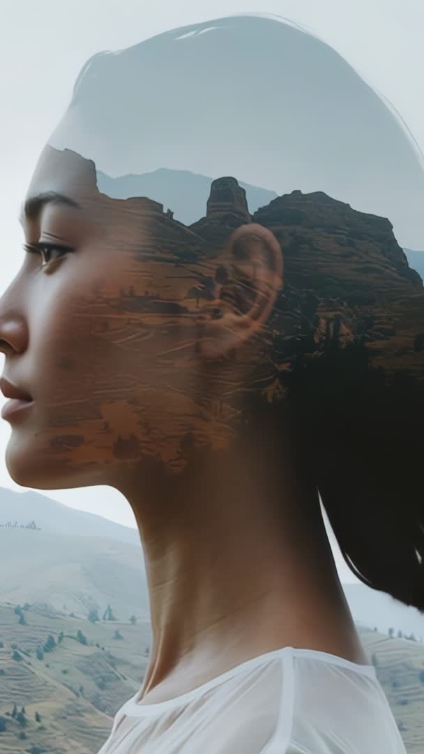 Vertical double exposure merging woman profile with rolling hills for mindfulness and calm Video