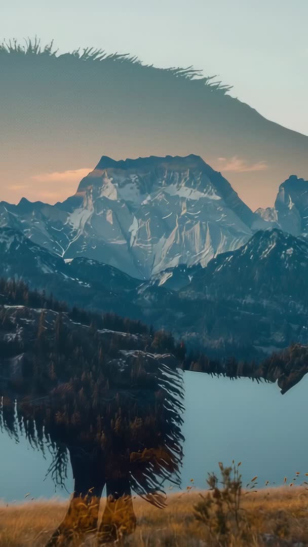 AI Generated Video. Featuring vertical double exposure combining shaggy silhouette with snow-capped mountain, alpine meadow, and mirror lake reflection. Capturing warm sunrise glow and cool mountain tones to create cinematic layered effect. Working well for social media reels, mobile wallpapers, creative video intros, travel and adventure promos, nature documentaries, and meditation apps. Allowing editors to crop for vertical formats, add text overlays, or use as looping background for titles and product showcases. Providing high contrast areas for logo placement and flexible color grading for mood adjustment. Suggesting slow ambient soundtrack and gentle crossfade for seamless loop and immersive viewer experience.