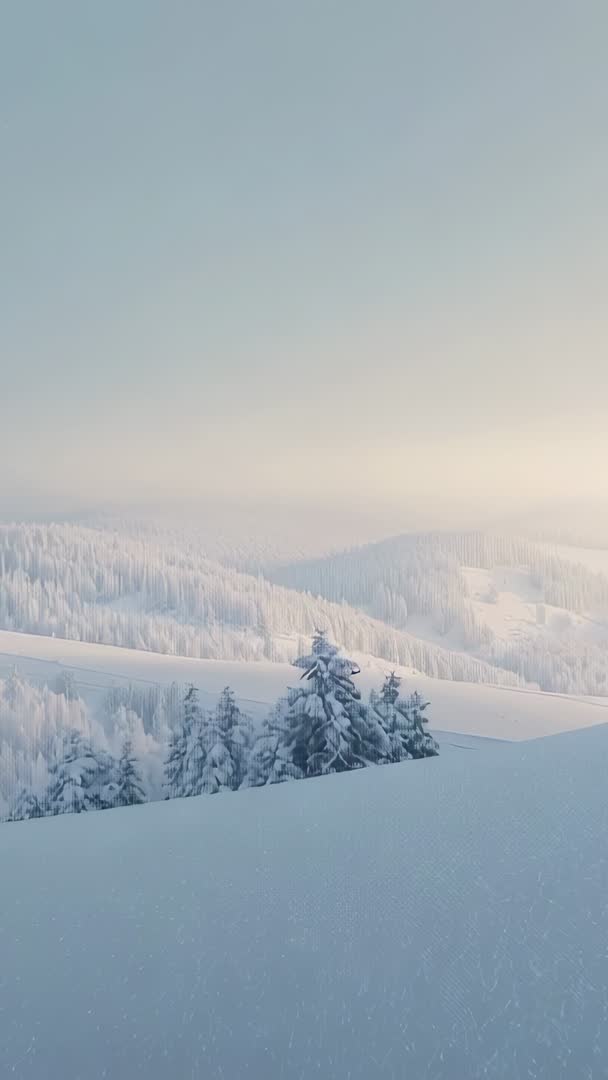 AI Generated Video. Camera drifting upward and revealing snow-laden fir trees on gentle alpine slope, framing soft pastel horizon glow and layered snowy ridges. Shot captured in vertical 9:16 format, making it ideal for mobile video, Instagram Reels, TikTok, and vertical website headers. Falling snow and muted light creating calm, meditative mood suitable for holiday greeting backgrounds, winter travel promotions, ski resort ads, nature documentary intros, meditation or wellness app visuals. Generous negative space and slow motion offering easy placement of text, logos, or title cards for marketing and editorial use. Looping smoothly for ambient background on digital signage, presentation slides, or streaming intros. Pairing well with soft ambient music, wind textures, or subtle orchestral pad to heighten atmosphere.