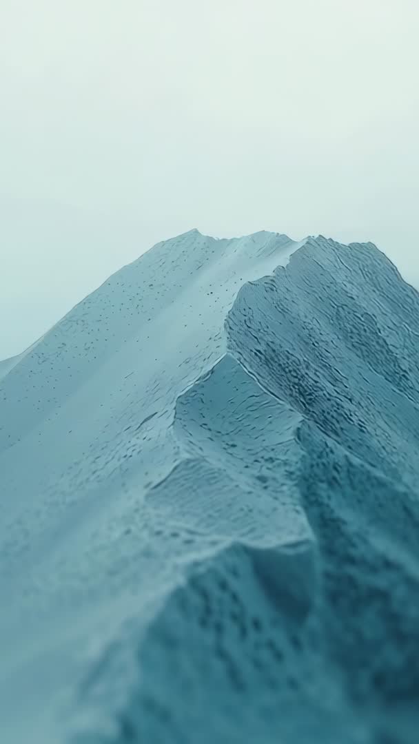 AI Generated Image. Vertical footage showing camera advancing along misty mountain ridge, revealing layered textured blue slopes and deep atmospheric fog. Slow cinematic movement capturing subtle light, fine surface detail, and soft gradient sky, creating calm, contemplative mood. Use for mobile-friendly backgrounds, wellness and meditation apps, social media vertical ads, travel and adventure promos, nature documentary titles, environmental awareness campaigns. Ideal for split-screen layouts, hero sections, vertical banner ads, cinematic Instagram Reels, TikTok videos. Color palette providing cool blue tonality pairing well with sans-serif titles and minimalist graphics. Loop-friendly composition, slow motion compatible, negative space for overlay text and logo placement.