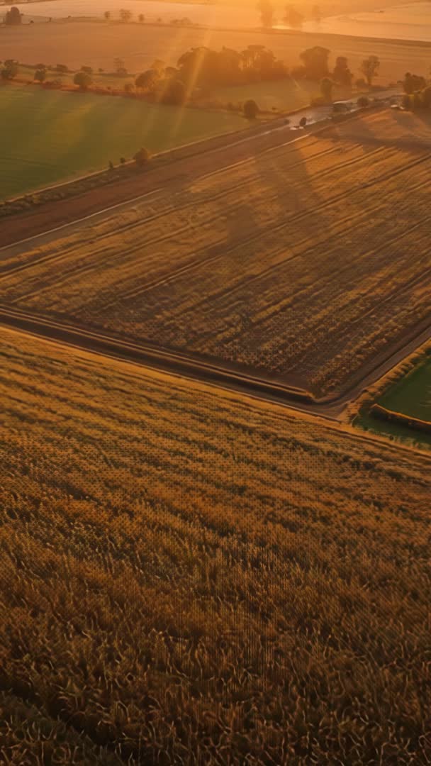 AI Generated Image. Showing vertical drone ascent drifting back over golden farmland during sunset, capturing long sunbeams cutting across patterned fields and cars moving along country road. Emphasizing warm golden-hour light, diagonal composition, and gentle upward camera motion for cinematic feel. Working well for social media vertical video ads, travel and tourism promos, agricultural and harvest marketing, environmental storytelling, and cinematic openers. Pairing with ambient or acoustic music for contemplative mood and title overlays for intros or transitions. Delivering versatile aerial footage for stock licensing, commercials, editorial use, and adaptable cropping for widescreen edits.