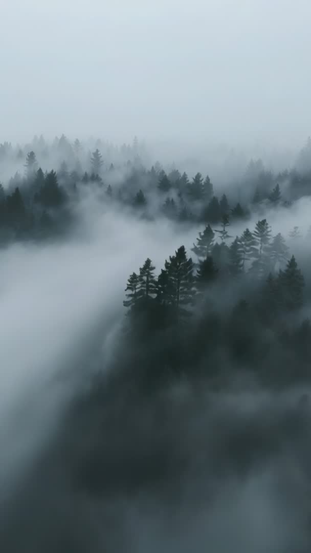 AI Generated Video. Vertical footage showing drone descending through dense fog, revealing cluster of conifers along narrow ridge. Layers of mist weaving through tree crowns, creating deep sense of depth and dramatic silhouettes against muted teal-gray sky. Camera movement slow and steady, creating cinematic, meditative pace and immersive vertical composition. Ideal uses include background for title sequences, social media reels, guided meditation apps, travel and conservation campaigns, film opening credits, ambient B-roll for commercials. Production tips: looping for ambient backgrounds, pairing with soft drone music or wind soundscapes, color grading to cool tones for mysterious mood or warming tint for sunrise impression. Delivery notes: vertical format optimized for smartphone playback and stories, high resolution allowing crop into widescreen if needed. Licensing suggestions: editorial and commercial usage for branding projects, environmental messaging, wellness content, and cinematic sequences.