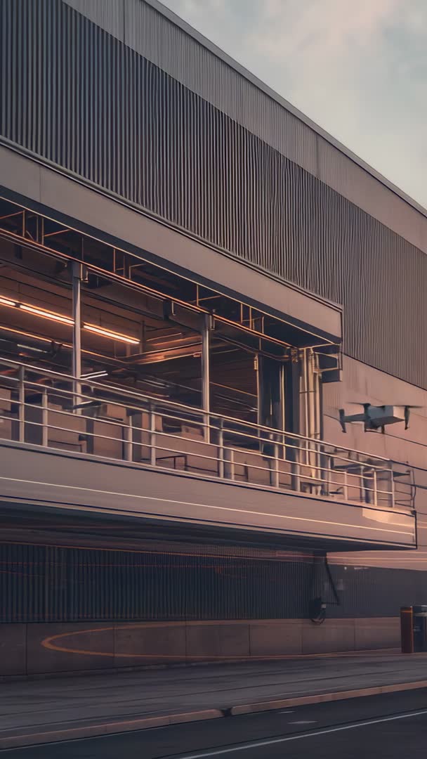 AI Generated Image. Showing vertical drone entering industrial balcony area and hovering near platform railing while warm interior lights are glowing at dusk. Highlighting metal facade, exposed piping, and linear railings with cinematic low-light mood. Useful for tech and drone service promos, surveillance and security presentations, industrial inspection tutorials, architectural and urban planning reels, and vertical social media ads. Working well as opener for corporate videos, background for trade publication stories, or cutaway for news segments about infrastructure and logistics. Suggested usage: apply subtle color grade to emphasize warm interior lighting against cool exterior metal, crop for mobile story format, add motion-stabilized reveal or slow push-in for dramatic effect.