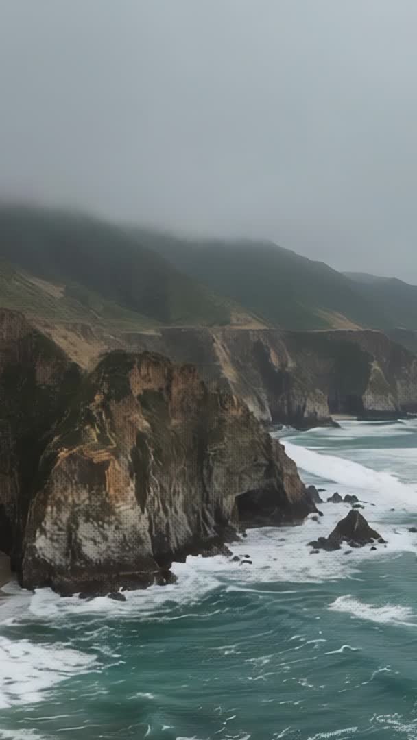 AI Generated Image. Featuring vertical drone footage moving along rugged coastal cliffs while waves crashing and foam gathering along rocky shore. Showing moody overcast sky and low cloud hugging hilltops for dramatic atmosphere. Providing wide copy space in upper frame for titles or captions. Working well for travel promos, nature documentaries, coastal conservation campaigns, ocean safety messages, social media reels, website hero backgrounds, cinematic B-roll and advertising. Offering slow motion-friendly movement and strong color contrast between teal water and earthy cliffs. Recommending edit ideas: adding gentle ambient ocean sound, applying subtle color grade to enhance teal tones, inserting title text in sky area, trimming to vertical aspect ratio for mobile-first platforms. Suitable for reels, stories, TikTok clips, travel blogs, nature channels, advertising, and environmental campaigns.
