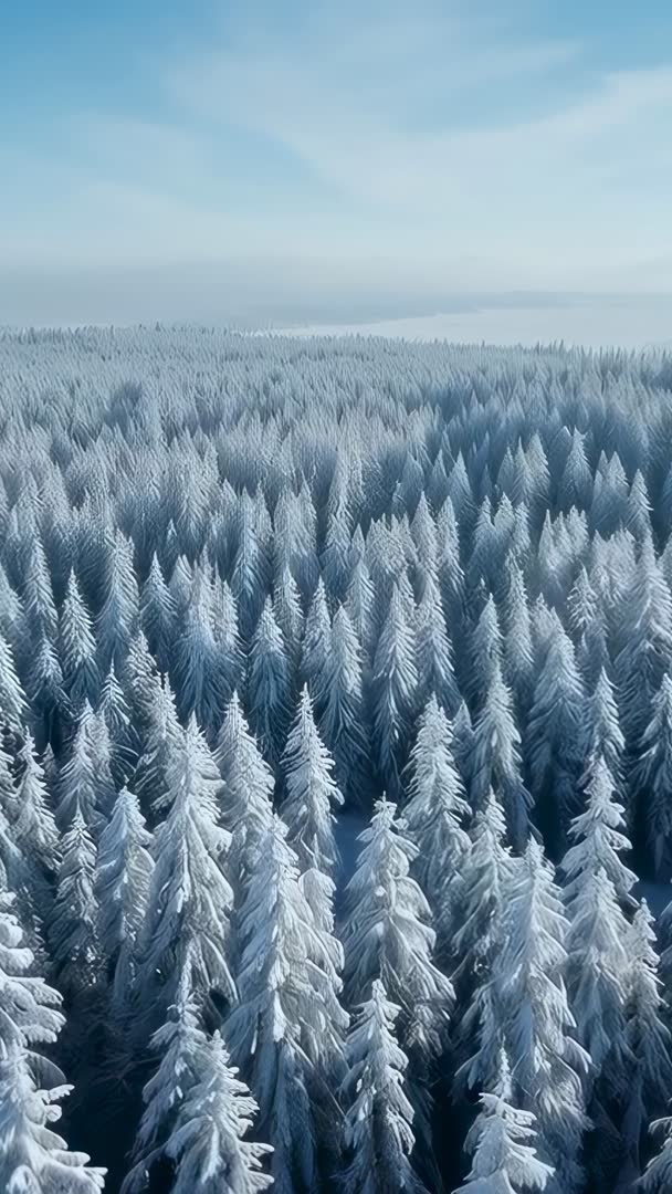 AI Generated Video. Vertical drone footage gliding slowly over frosted conifer canopy, revealing endless snowy forest and distant horizon. Scene showcasing dense pine and spruce trees heavy with frost, soft blue sky, and muted winter light. Useful for travel videos, nature documentaries, environmental campaigns, seasonal marketing, and social media reels. Ideal for vertical ad creatives, Instagram and TikTok reels, mobile wallpapers, cinematic openers, or looping background for websites and storefront displays. Recommend slow cinematic soundtrack, cool color grade, subtle parallax text overlay, and 6-12 second loop cuts for mobile use. Also suitable for forest monitoring visuals, land survey previews, and conservation storytelling.