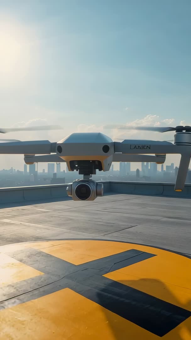 AI Generated Image. Vertical video showing drone lifting from rooftop helipad, hovering above helipad marking while gimbal camera capturing wide urban skyline bathed in warm sunrise light and lens flare. Clip providing cinematic, smooth aerial movement, suiting city promos, real estate aerial tours, technology demos, news segments, and social media vertical ads. Suiting 9:16 format for Instagram Reels, TikTok, vertical hero banners, mobile ads, and in-story content. Editing tips: trying gentle stabilization, warm color grade, slow ramping for dramatic reveal, adding city title text and lower third. Footage featuring pilot-controlled takeoff, highrise silhouettes, and soft sunlight creating modern professional mood.